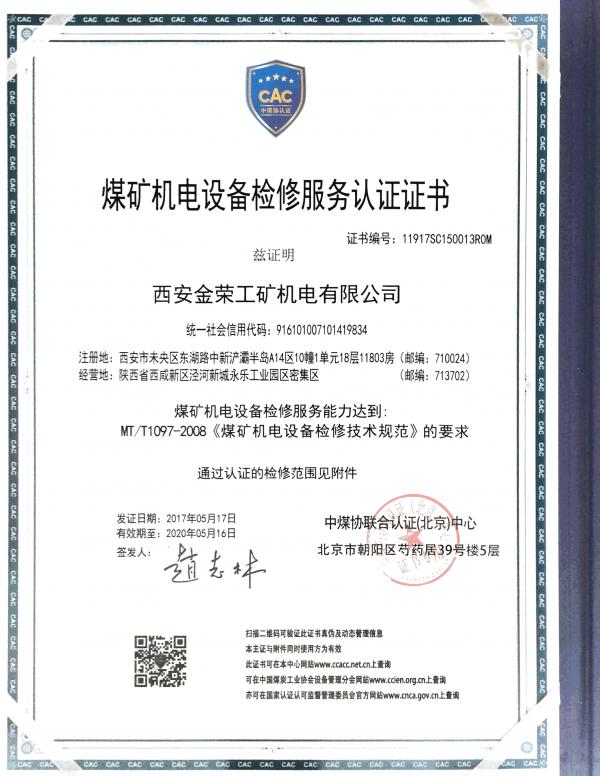 煤礦設(shè)備檢修服務(wù)認證證書